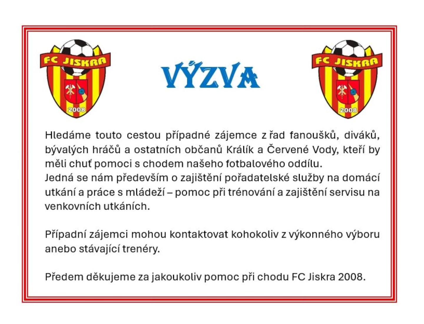 VÝZVA PRO FANOUŠKY, BÝVALÉ HRÁČE A OSTATNÍ OBČANY